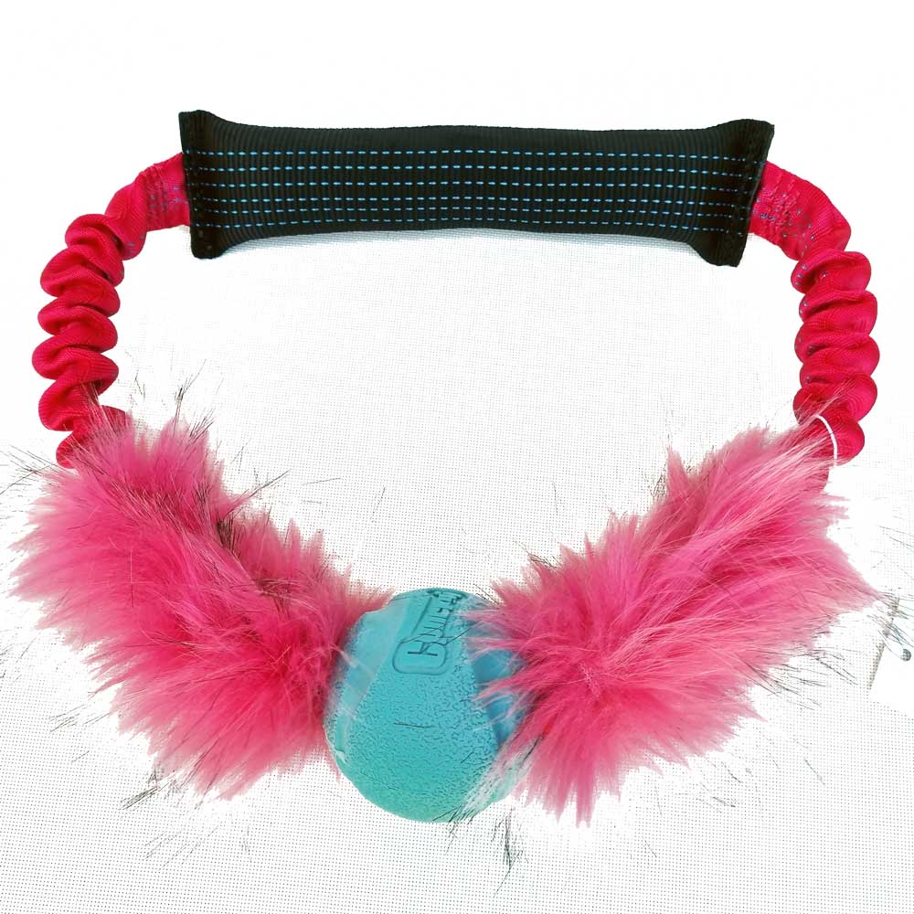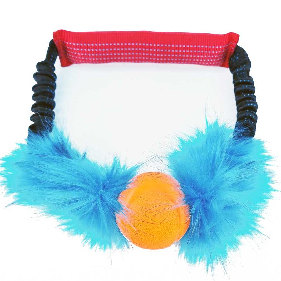 Made of lovely fluffy luxury faux fur at one end with Chuckit in the middle and hose with filling at the other, and elastic band in different colors in between. • The faux fur is thick and durable, and the dogs love it. • The elastic part reduces jerks for both the dog and the trainer during fighting play. • The handle is made of products that are also used by climbers, durable even for the strongest fighters.