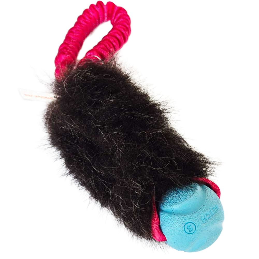 Made with sheepskin with fur & bungee handles in different colors and durable chuckit ball (nice Small size! )