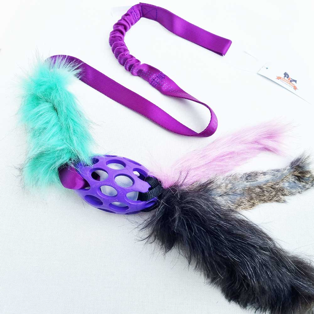 The toy consists of three arms, one made of fluffy Sheepskin, the other of Rabbit fur and the third one of fluffy high quality faux fur. The arms are attached to a JW Holee Football (two sizes of mini and small football available) with a nice size squeaker for added excitement.