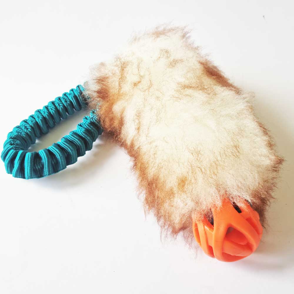 This bungee tug toy has an 8” luscious Sheepskin with a Chuckit Breathe Right ball on the end. The sheepskin is about 2 and a half inches wide and is stitched directly to the webbing. Great for dogs that like the scent of something real!