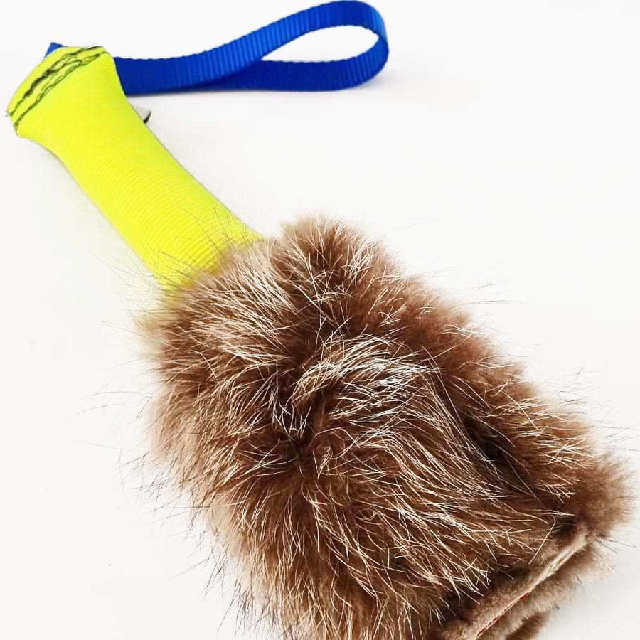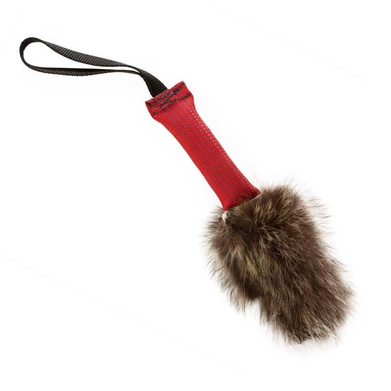 The 7.5" long handle is made from soft-touch nylon so it's very comfortable on your hand. The 6"W x 2.25"H raccoon fur pouch is lined with 420 Denier Kentucky Pack Cloth so that you can keep it clean. It has a tab on each side to make the Velcro seal easier to open. The tug stick portion of the toy is 6"L x 1.25"W.