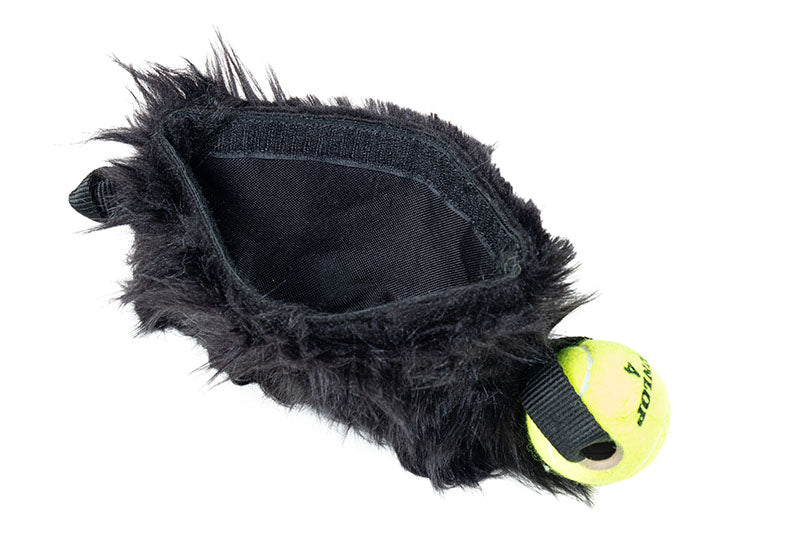 The Rabbit Fur Treat pouch is lined with water resistant fabric and on a web handle. The Velcro opening which provides that “sound cue ” when the treat bag is opened
