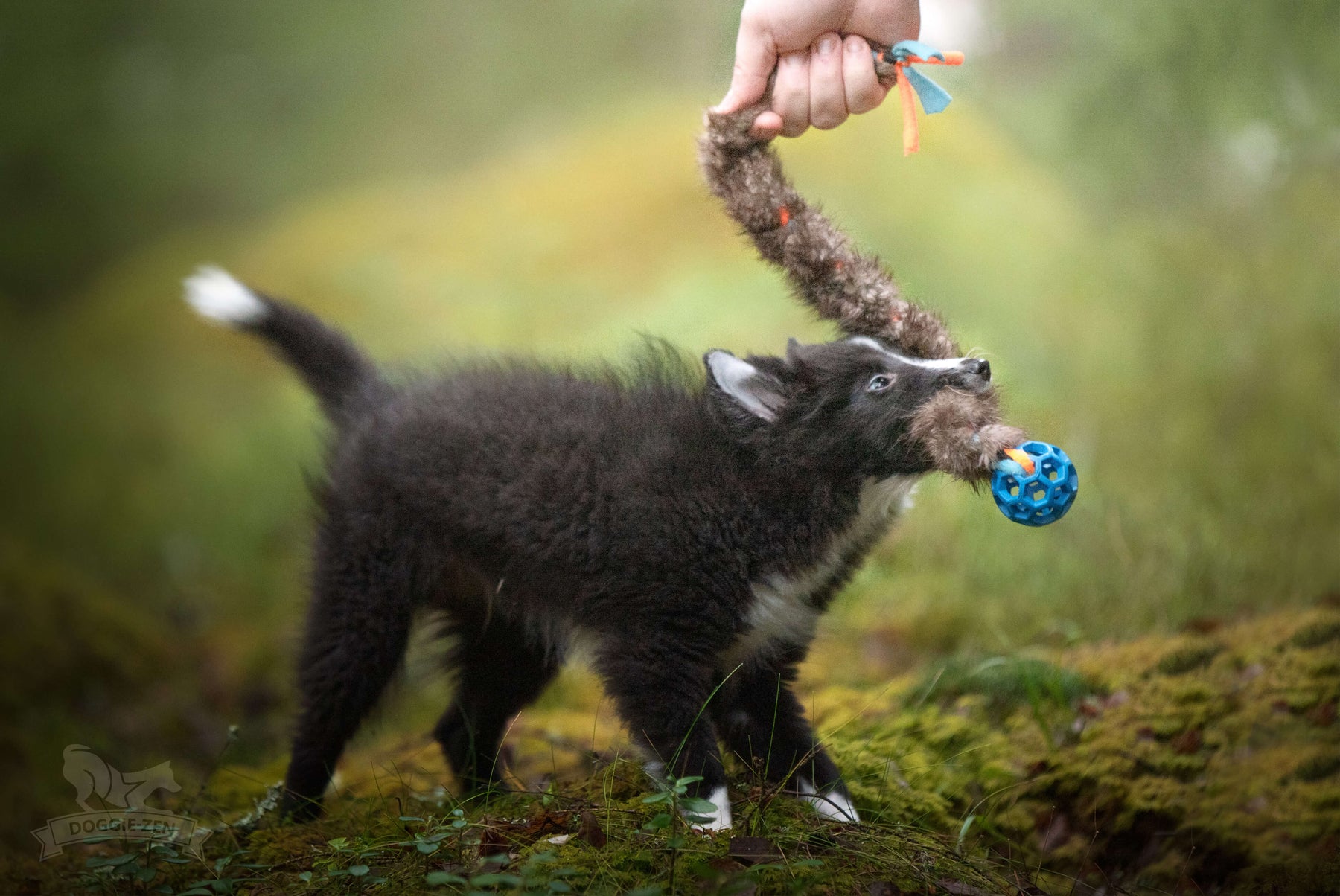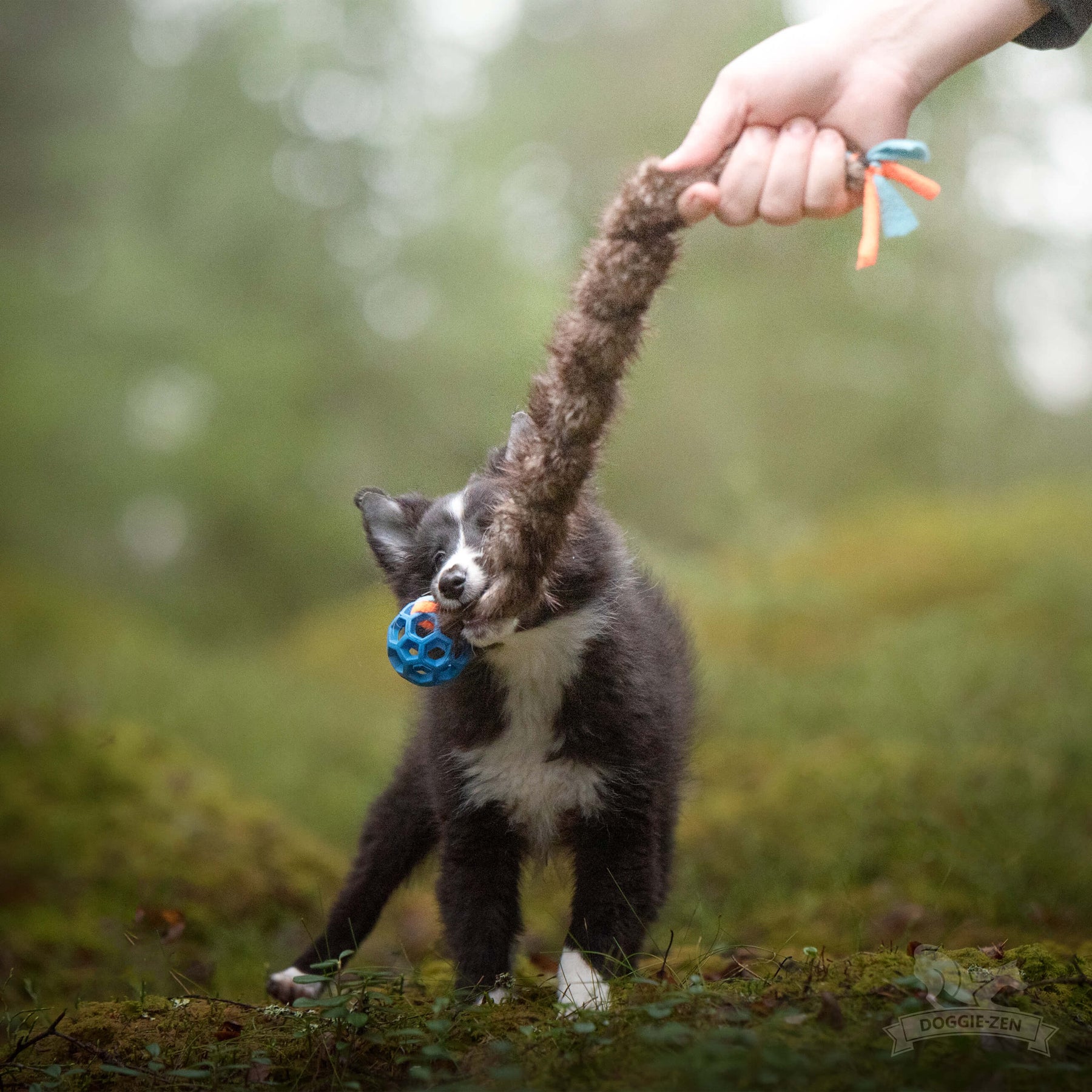 This version is longer, to both offer fun games of chase and to prevent you from bending down as much. The toy consists of a fleece braid woven with soft and durable beaver skin and Hol-ee Roller in size Mini. It is also possible to get a squeaker pillow put into the ball to make it a fun squeaker toy.